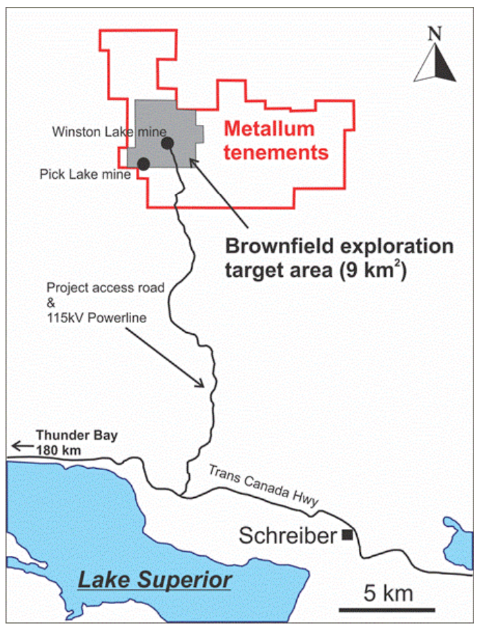 Winston Lake forms part of Metallum Resources Inc's ("Metallum") Superior Zinc and Copper Polymetallic Project located near the town of Schreiber, east of Thunder Bay, Ontario, as outlined in Figure 5. Inmet Mining, subsequently acquired by FQM, commenced development of Winston Lake in 1986 with production continuing for 11 years, with additional ore added from the Pick Lake deposit from 1995 until operations were suspended in 1998. A total of 3.4Mt @ 1.0% Cu and 16% Zn was mined and processed with a current Indicated Mineral Resource at Winston Lake of 290,000t @ 10.4% Zn, 0.7% Cu, 0.9 g/t Au and 18 g/t Ag.