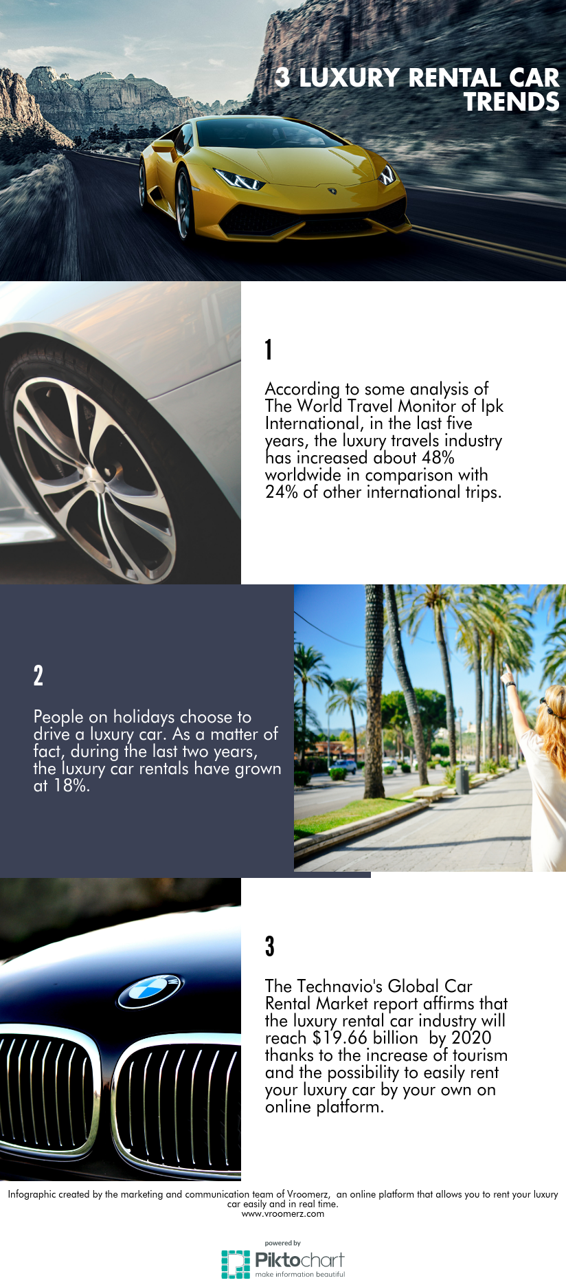 Vroomerz (www.vroomerz.com) is an innovative startup created by a professional team: the website structure allows the user to organize all information directly from the management information system and it proposes only the real available luxury cars in real time to users. Thus, the user has only to select the pick-up location and the drop-off location, the pick-up date and the drop-off date, the car category and the online platform will show a selected range of luxury cars that are available for rent in real time.