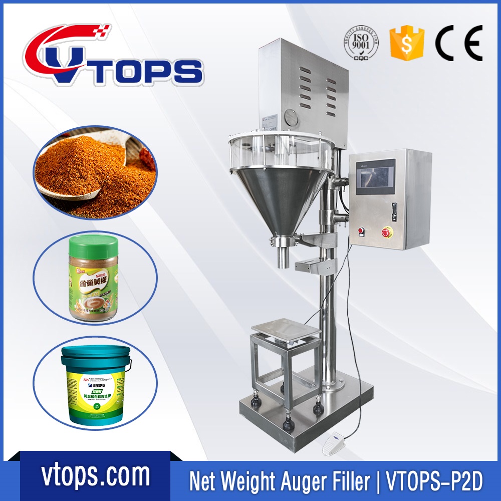 The engineers introduced Vtops, which has two models of net weight auger filling machines; they are VTOPS-P2C and VTOPS-P2D. VTOPS-P2C has a clamp hold bags device; it is used for bags or pouches. VTOPS-P2D has a weighing desk that is used for bottles or pails.