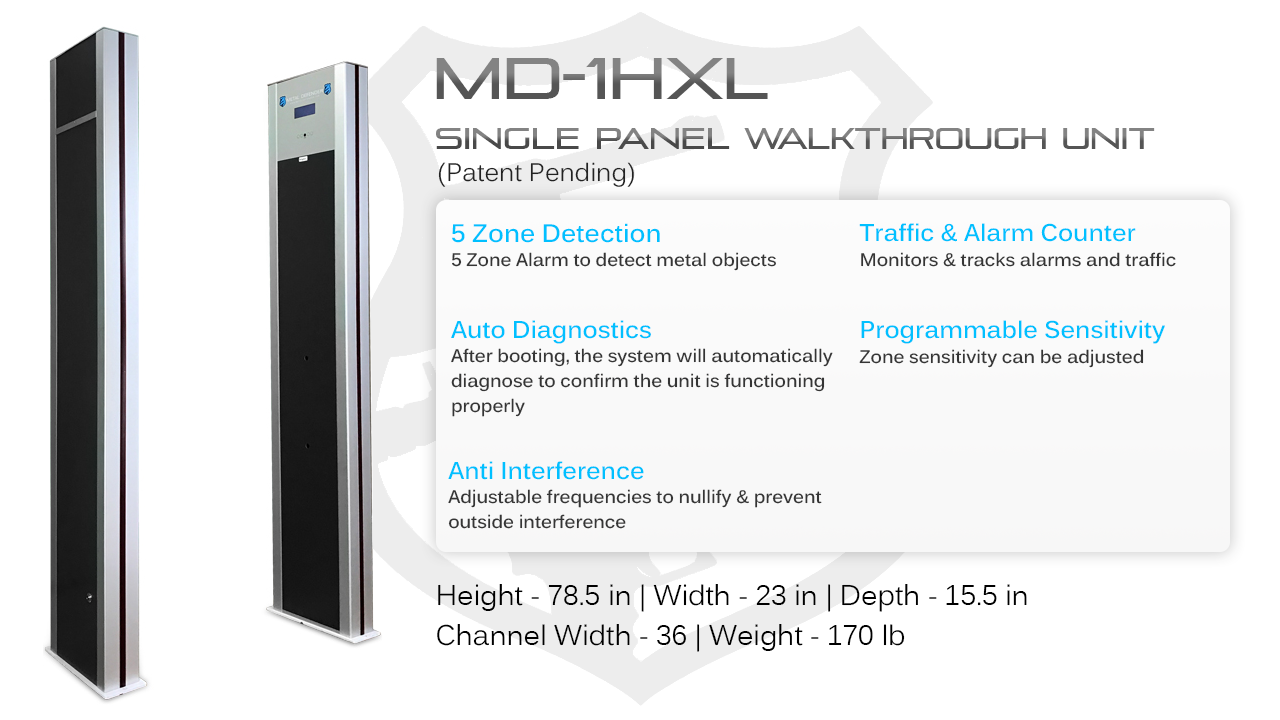 First, the passageway is adjustable. The two opposing uprights can be placed between 28 to 46 inches. All current standard Walk Through Metal Detectors have a fixed width, typically between 28 and 32 inches. So this new design can replace any of the old designed models, as well as expand to 42 inches. The wider passage allows for wheelchair accessibility and even allows for two patrons or customers to pass at the same time. They have been in good use at hospitals to allow access for gurneys and patients. This wider passage expedites the screening process and allows a parent to pass through with their child or elderly parent.