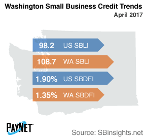 Coming in at 108.7, the PayNet Small Business Lending Index (SBLI) for Washington rose 0.3% from the previous month's state level and was 10.7% greater than the national SBLI level this month. Small business borrowers are cautiously increasing investment.