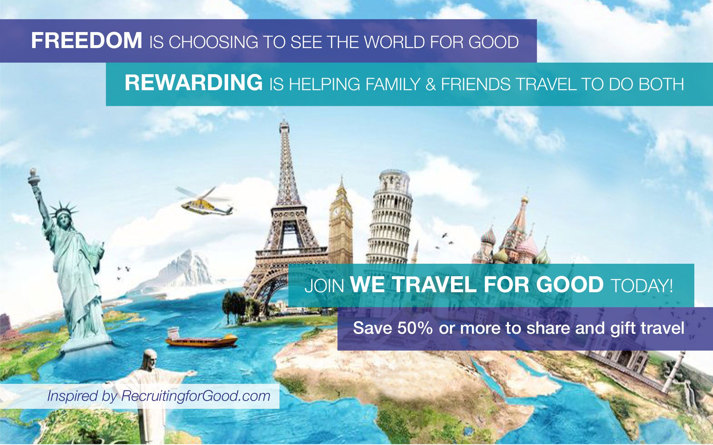 Freedom is choosing to see the world for good. Rewarding is helping family and friends travel to do both. Join We Travel for Good today! Save 50% or more to gift and share travel.