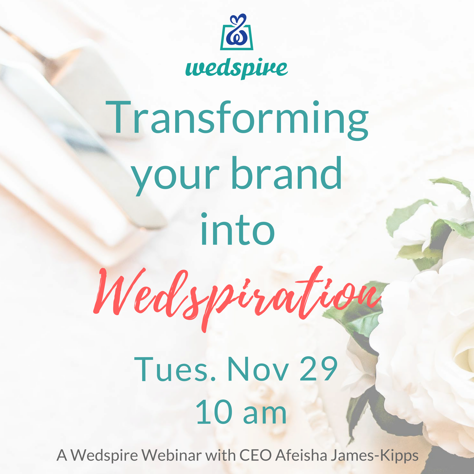 The first gift from Wedspire is the gift of education. On Tuesday, November 29th at 10am, Co-founder Afeisha James-Kipps will be joining Wedding Pro’s around the nation for a live interactive webinar: Transforming your Brand Into Wedspiration. This webinar will help the attendee learn more about today’s brides; how they are planning, what they expect and how to meet those expectations in a successful way.
