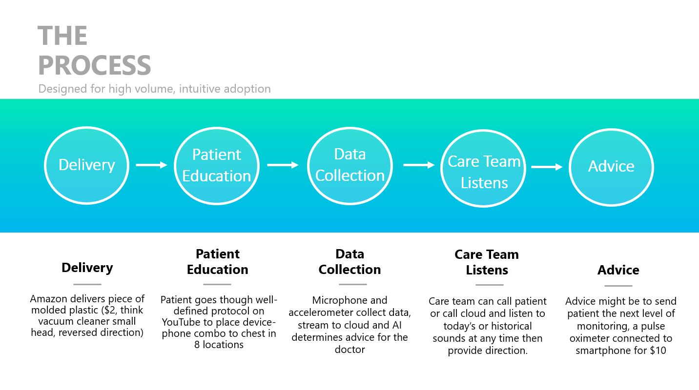 SoundMedicine, LLC (SM) – is a research firm based in Waltham, MA, focused on the capture of acoustic waves generated by the lungs alongside other biomarkers. SM was awarded a patent in 2017 by the US Patent Office for its proprietary technology used to detect a medical condition using a mobile computing device. www.soundmedi.com