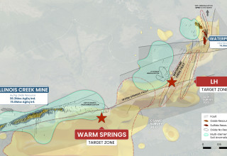- Target Zone #2: "WARM SPRINGS" ("WS") lies close to the past-producing Illinois Creek gold mine, interpreted to lie near the source of the system. WS also shows historic high-grade oxide intercepts up-dip from the target zone and similar geophysical and soil geochemical signatures to Waterpump Creek.