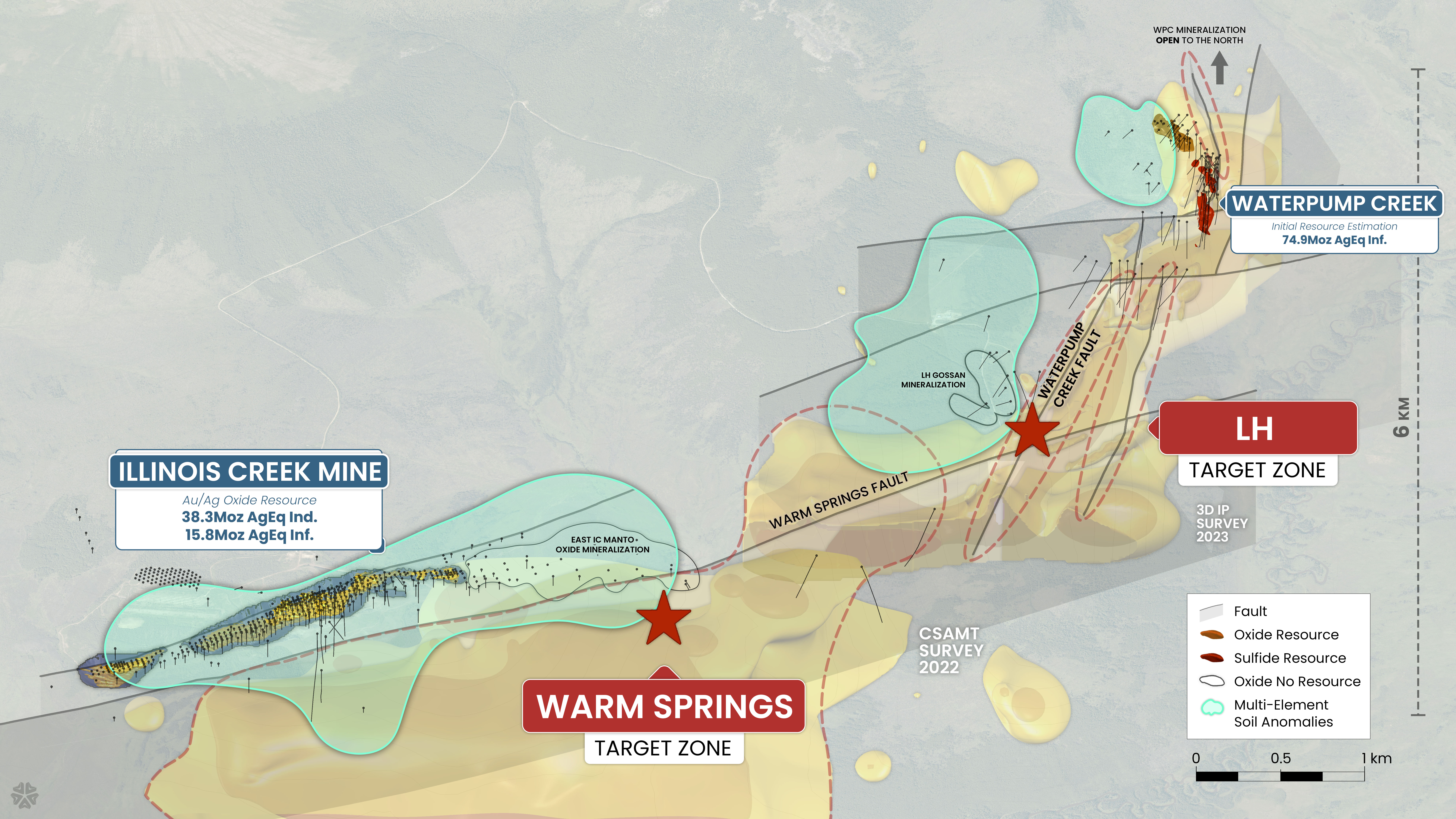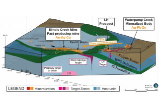 2024 drilling is focused on finding additional bodies of high-grade sulphide mineralization similar to those of the Waterpump Creek Resource (See Press Release of April 2, 2024) along the 6 to 8 km trend between WPC and the historic Illinois Creek Mine, which is believed to lie proximal to the system's source. Targets are based on an updated geologic model generated through compiling 2022 CSAMT and 2023 3D IP geophysical surveys, historic up-dip oxide drill intercepts, and soil geochemistry similar to those marking Waterpump Creek. The 4,000 meters will be allocated alternately between the two zones described below with the later season drilling expected to focus on the areas with the most promising early results.