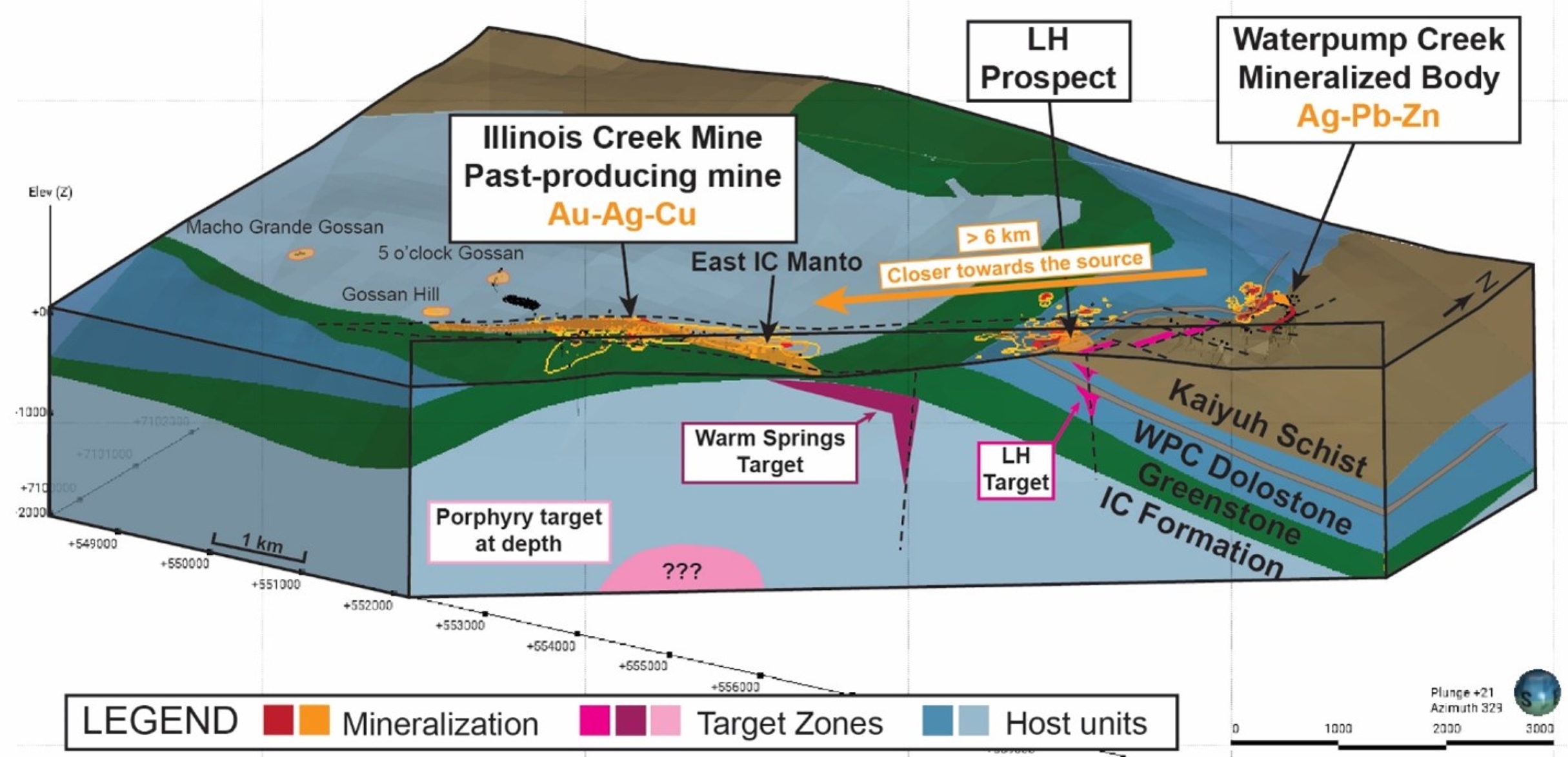 - DRILL TARGETS are located along approximately 5 km of an 8 km long, SW-NE oriented trend connecting the Waterpump Creek, Warm Springs and Illinois Creek Mine systems. Initial targets lie 2.5 km (LH Zone) and 5 km (WS Zone) respectively, from the high-grade Waterpump Creek silver-zinc-lead NI 43-101 inferred resource containing 74.9 Moz at 980 g/t AgEq* (See Press Release dated April 2, 2024), with later drilling tentatively planned near the Illinois Creek Mine zone, which lies anther 2 km along the trend.