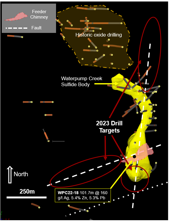 In Figure 2, drill intercepts from 2021-2022 define the 3D shape (yellow) of the Waterpump Creek sulfide body. Red circles show 2023 target areas to be drilled to extend known sulfide mineralization. The historical oxide body outline is shown to the north.