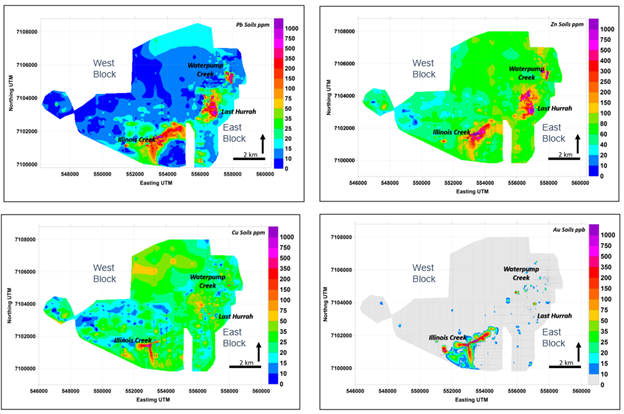 In the East Block, major lead-zinc anomalies occur in dolomites, reflecting leakage from the Waterpump Creek feeder structure. A major soil anomaly at the Last Hurrah target continues for another 2 kilometers and may reflect the presence of the Waterpump feeder fault downdip.