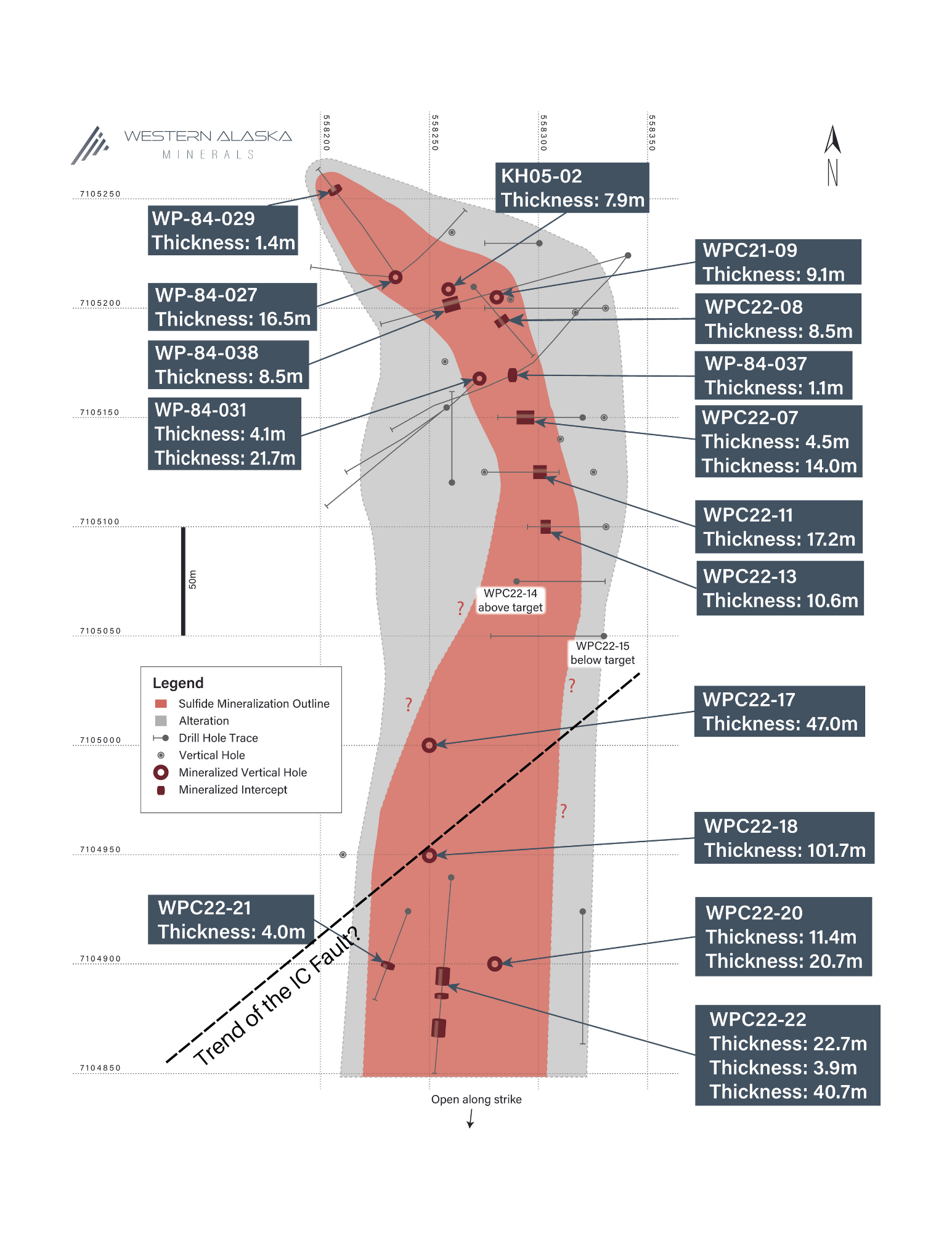 Kit Marrs, Western Alaska Minerals CEO, stated "Our 2022 drilling program at Waterpump Creek has now outlined a 400 meter long trend of high grade silver-lead-zinc mineralization. This is a significant step towards defining an economic CRD deposit. Mineralization has thickened and become wider as the drilling has moved south along trend. Our 2022 drilling success, along with the results of the June CSAMT geophysical survey has demonstrated that we have a major CRD system with excellent potential for additional discovery. The two exploration holes, IC22-01 and IC22-02, completed to date on targets outlined by the CSAMT survey, demonstrate that we are just now understanding the potential of this CRD system."