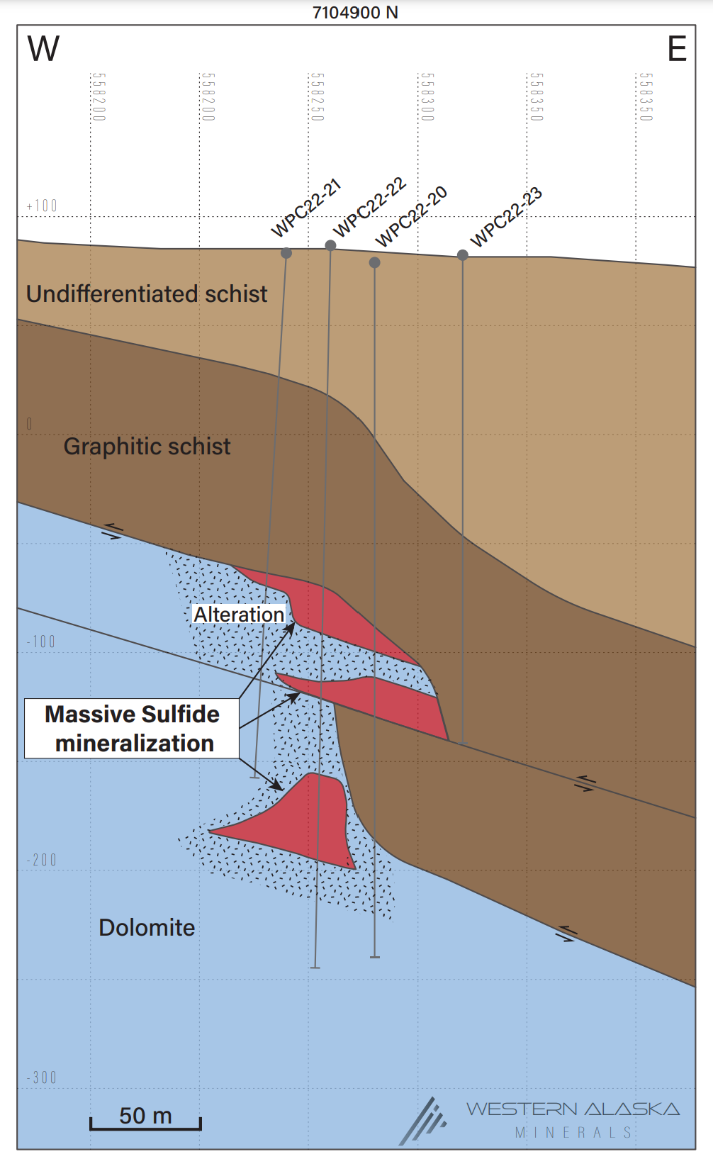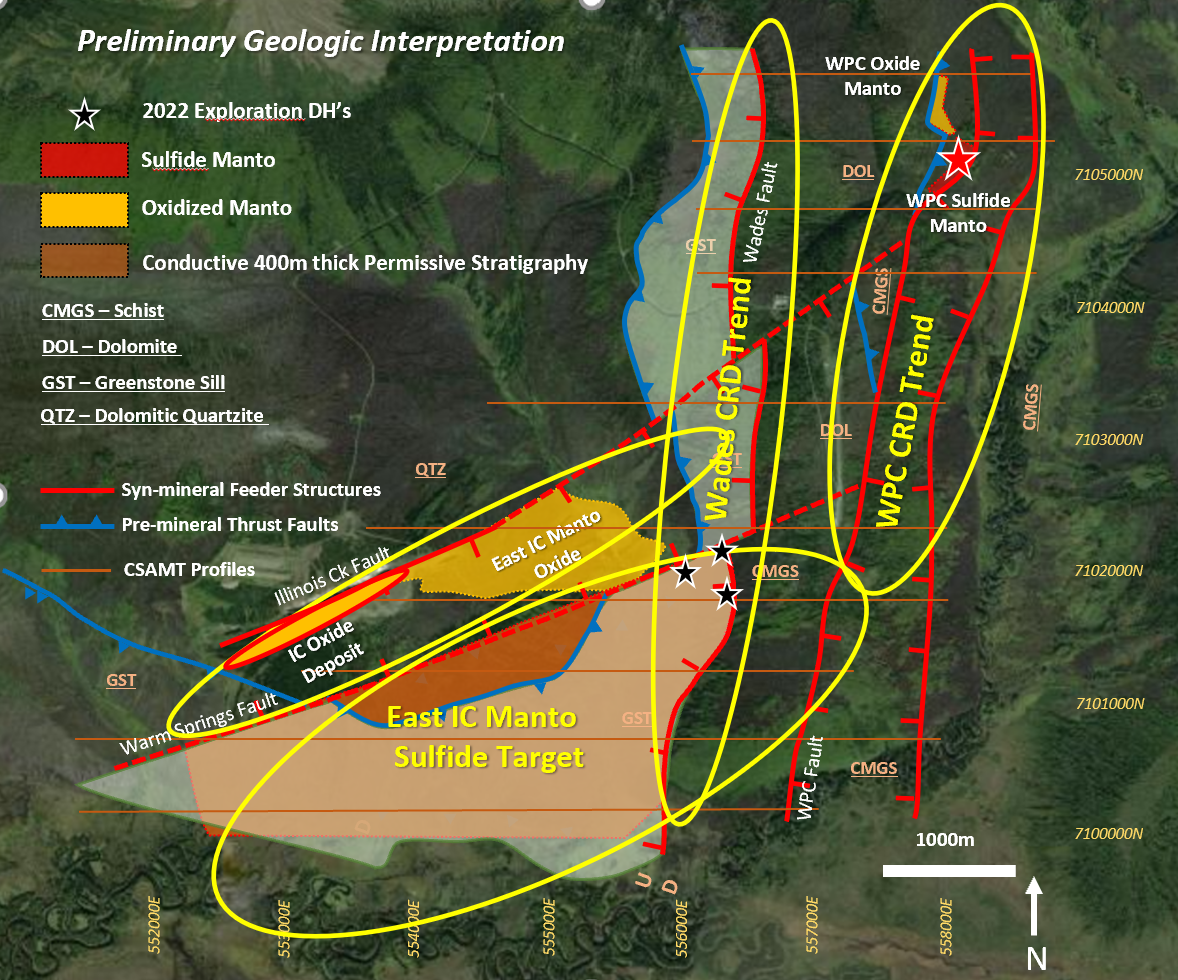 The manto mineralization encountered to date forms an elongate body 30 to 75 meters wide and 400 meters in length plunging gently to the south in the footwall dolomite adjacent to the WPC Creek structure. The overall architecture defined in the 2022 CSAMT profiles, indicates this structure is the western margin of a graben-like depression 500 to 600 meters wide that down-drops and drapes the overlying chlorite and graphite schist package onto the underlying dolomite section. As discussed earlier, there is an apparent chimney at the intersection of the WPC manto and the projection of the Illinois Creek Fault.