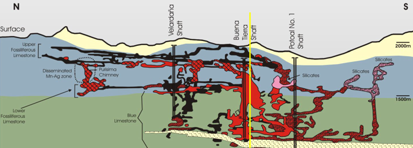 Figure 2. Cross-section of the West Santa Eulalia District showing stacked mantos over 1km of stratigraphic thickness. (courtesy Peter Megaw)