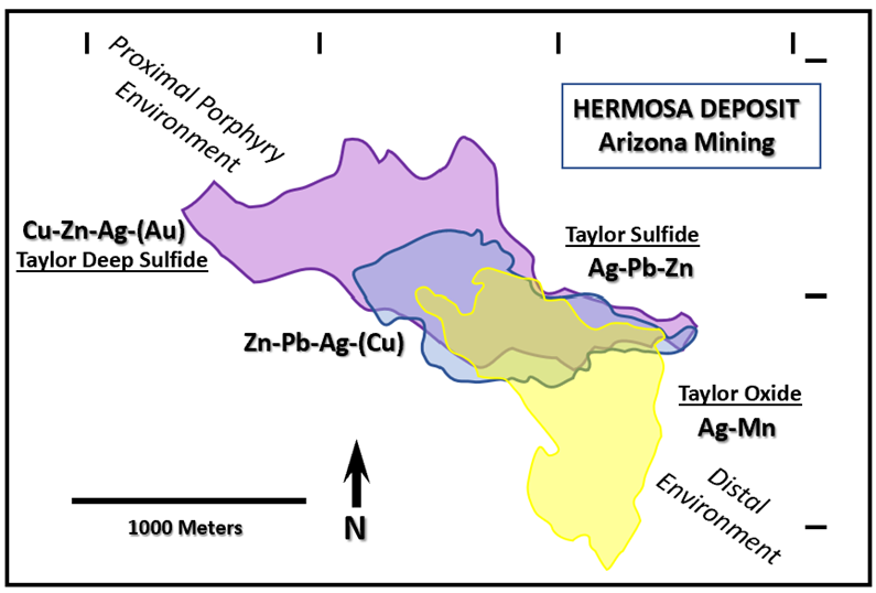 Figure 3. Plan view of the Hermosa/Taylor Deposit, AZ showing both lateral and vertical metal zonation in the stacked mantos. (modified from AZ Mining, 2018)