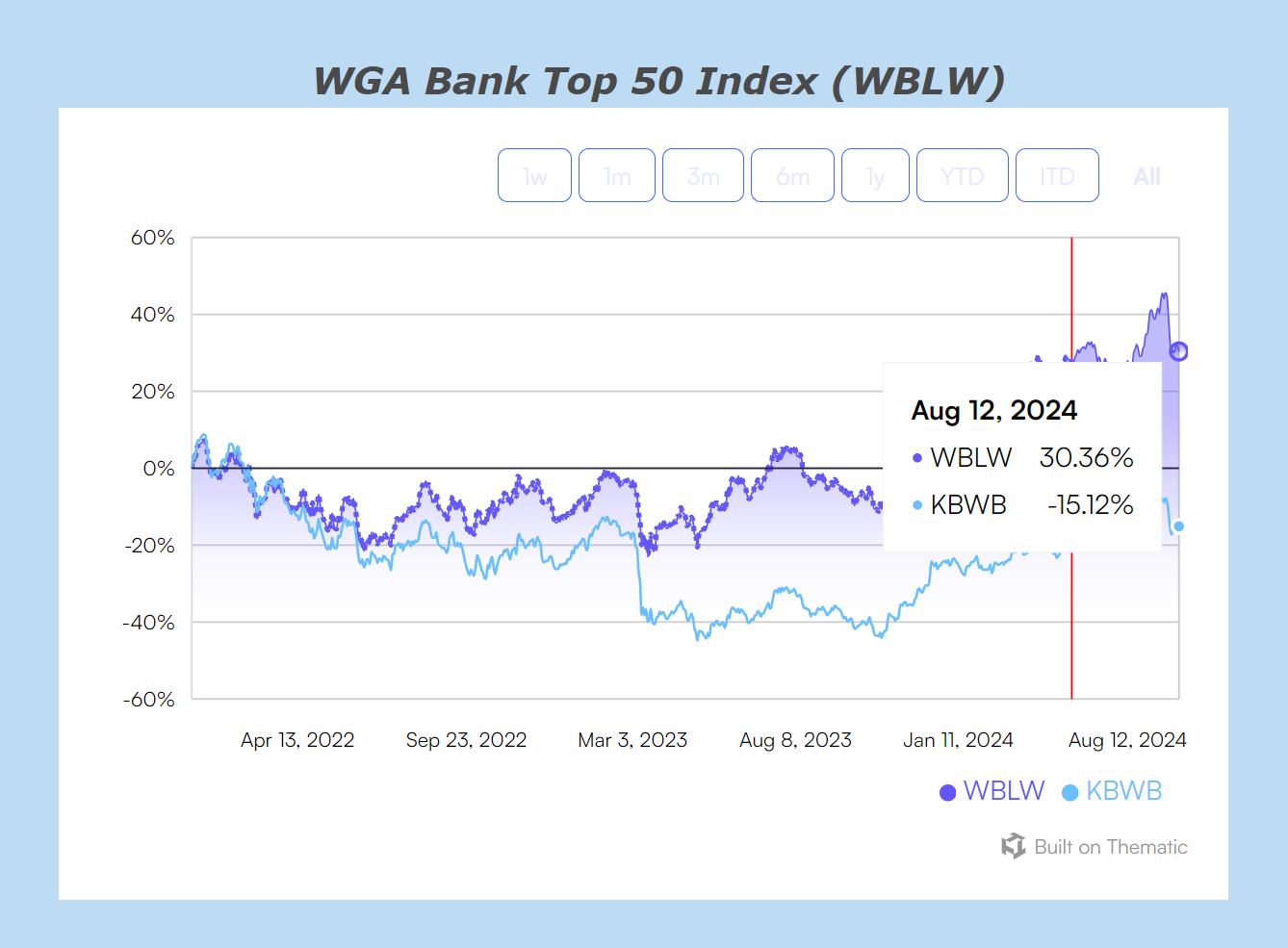 The constituents of the WGA Bank Indices are self-selected based upon WGA’s proprietary measures of financial performance and market returns. Each bank essentially votes for itself in a census based upon the institution’s market and financial performance. WGA works with our partners at Thematic to produce the Indices.