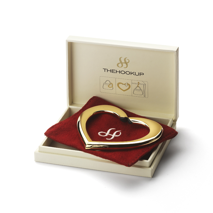 TheHookUp is a lightweight purse hanger (weighing only 1.4 oz) made from quality metal. TheHookUp is designed to support up to 30 pounds of handbag weight and when closed takes the shape of a heart, fitting perfectly on your purse as an accessory when not in use. With a simple twist, the product takes the shape of a "S," allowing your designer handbag to hang flawlessly from just about any surface. This innovative purse hanger will come in handy in any restaurant, coffee shop, bar, theatre, lecture hall, or restroom where there are no hooks available to safely hang your purse from. TheHookUp is so versatile that it can even hang over the door handle in a car or taxi, preventing the contents of your bag from spilling out during a sudden stop or turn. TheHookUp is currently sold exclusively online via the company's website (www.TheHookUp.com) and is available in platinum, gold plated, or black pearl finishes.