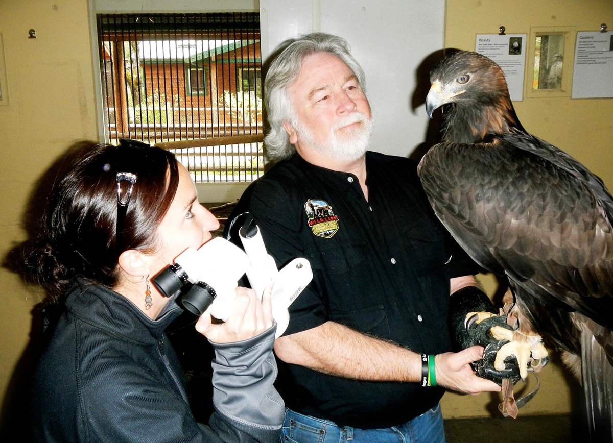 “Phoenix” the Golden Eagle has a special legacy at Wildlife Images. In 1980, Phoenix arrived at the center as a fuzzy baby eaglet. He had fallen from his nest onto a remote logging road out of Brookings, Oregon. Found by a caring truck driver who tucked him into his hardhat and contacted Wildlife Images, Phoenix began his rescue journey. As he grew into adulthood, Phoenix was deemed “non-releasable” because of his dependence on humans and in particular Dave Siddon, Executive Director of Wildlife Images. For nearly 35 years Phoenix has resided at Wildlife Images and contributed significantly to the centers educational and outreach programs by providing a deeper appreciation of his species and the importance of conserving and protecting our natural resources. “I’m very thankful to Dr. Bliss for the opportunity to help Phoenix,” said Dave, “what’s important to understand is when an eagle like Phoenix can’t see, his comfort and quality of life can deteriorate rapidly – we’ve noticed this happening in the last few months. The surgery, will give Phoenix many more years of ambassadorship as his life expectancy in captivity can be well into his 40’s.”