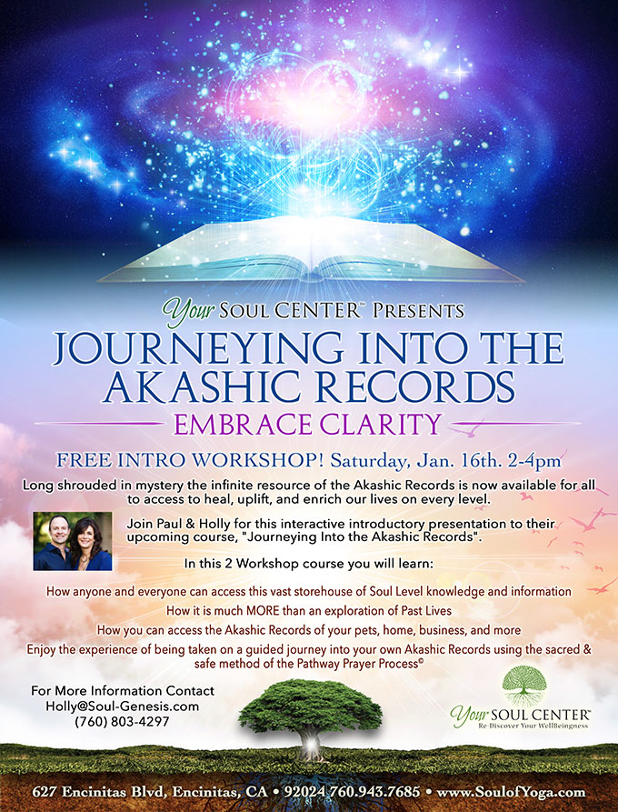 Encinitas, CA, December 23, 2015 (Newswire.com) - Journeying into the Akashic Records, This is a FREE Intro Workshop, Soul of Yoga, 627 Encinitas Boulevard, Encinitas, Ca, Saturday, January 16th, Free, 2:00 pm - 4:00 pm. Register now! This will for sure fill up.