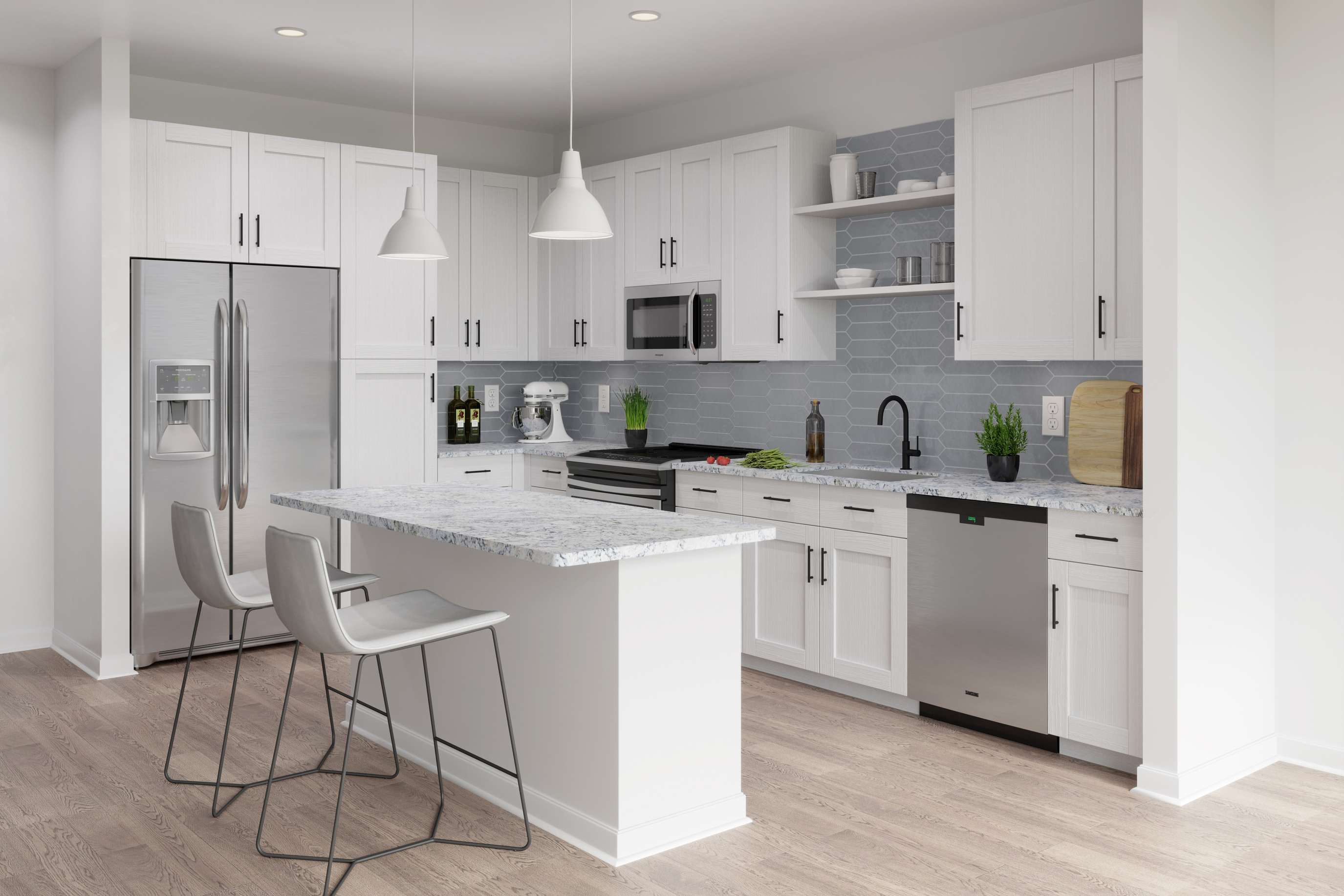 Each open-concept unit features high-end finishes to include low-profile stainless steel kitchen appliances, kitchen tile backsplashes, upgraded granite countertops in kitchens and baths, spacious walk-in closets, soft-close cabinetry with under-cabinet lighting and balconies with picturesque lake views. A resort-style lobby area, covered parking deck, and ride-share waiting area further enhance the Lake House by Alta experience for residents.