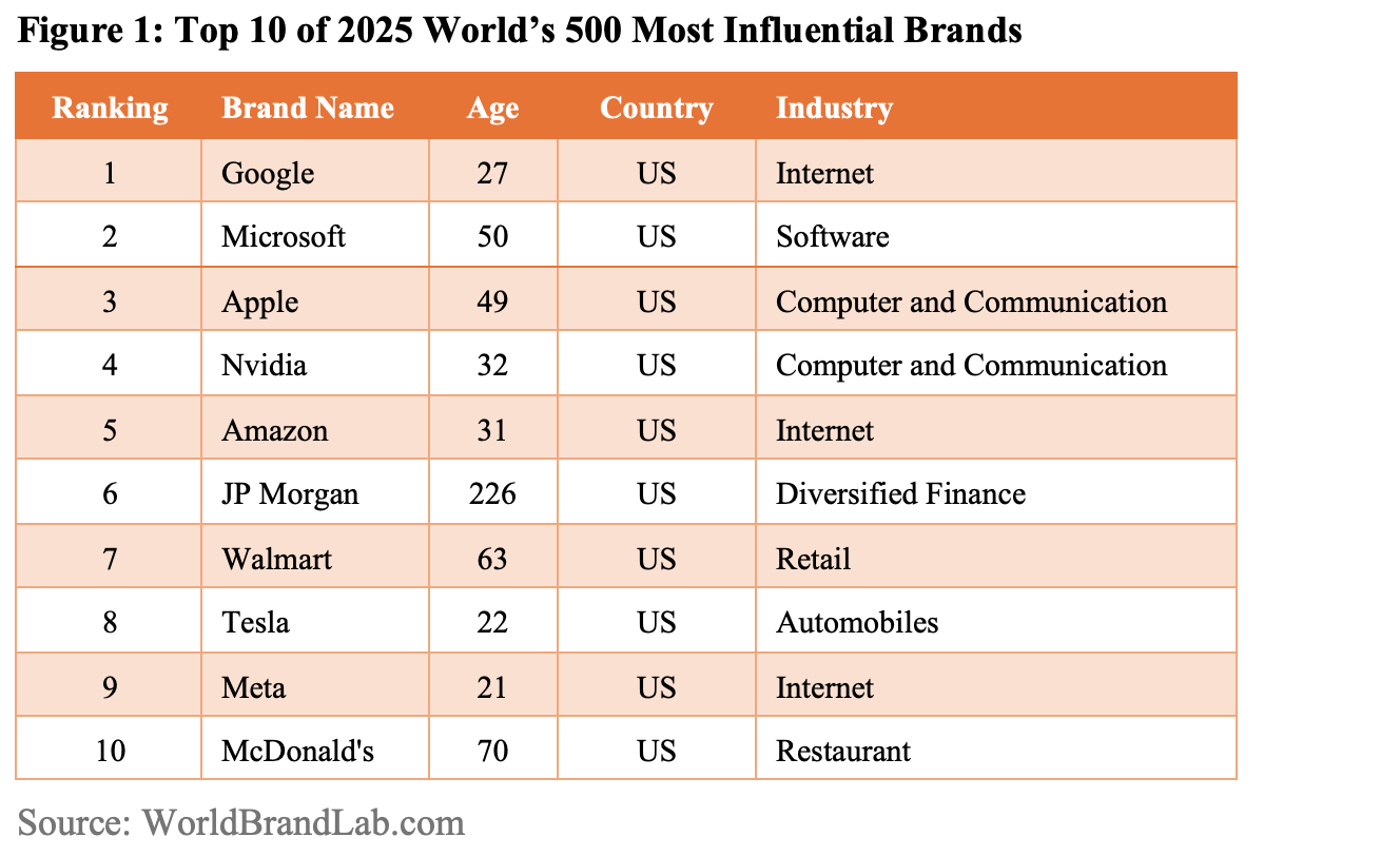 NEW YORK, December 16, 2025 (Newswire.com) - The 22nd edition of the list of the World's 500 Most Influential Brands, exclusively compiled by World Brand Lab, was unveiled on December 17 in New York, US, followed by a launch summit held in Hong Kong. Google surpassed Apple to take the top spot. Microsoft remained in second place, while Apple ranked third. The United States dominated the list with 184 entries, maintaining its position as the leading brand powerhouse. France, China, Japan, and the UK formed the second tier of global brand powerhouses. China, with 50 entries, once again surpassed Japan's 40, firmly securing the third position. Outstanding Chinese brands included State Grid, Tencent, Haier, China Resources, China Minmetals, China Southern Power Grid, Wuliangye, Poly, Air China, Changhong, Tsingtao, Sinochem, China Huadian, Hengli, Shenghong, XCMG, Hengtong, Tongwei, and Bosideng. In the era of artificial intelligence (AI), as brands serve as a core medium for contemporary cultural symbols, their creative expression is facing the double-edged impact of generative AI.