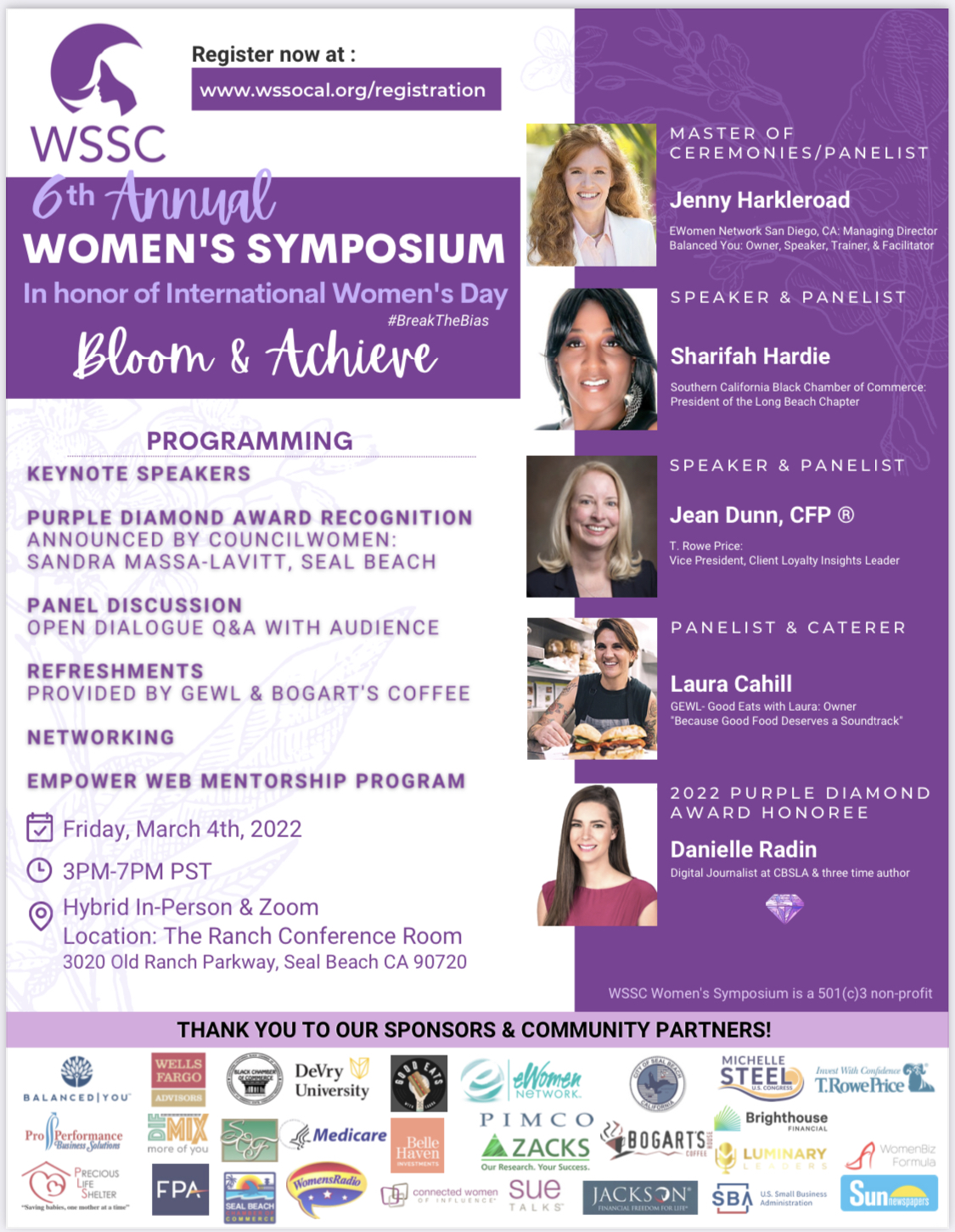 Local elected Councilwomen Sandra Massa-Leavitt, City of Seal Beach, will be presenting Danielle's honorary award at the 6th Annual Women's Symposium, an IRS tax exempt 501(c)(3) public nonprofit hybrid Zoom event. This year's theme is Bloom & Achieve. Join us on Friday, March 4, 2022, for an afternoon of confidence in honor of International Women's Day (IWD). For WSSC Women's Symposium event registration and additional information, visit the website at www.wssocal.org