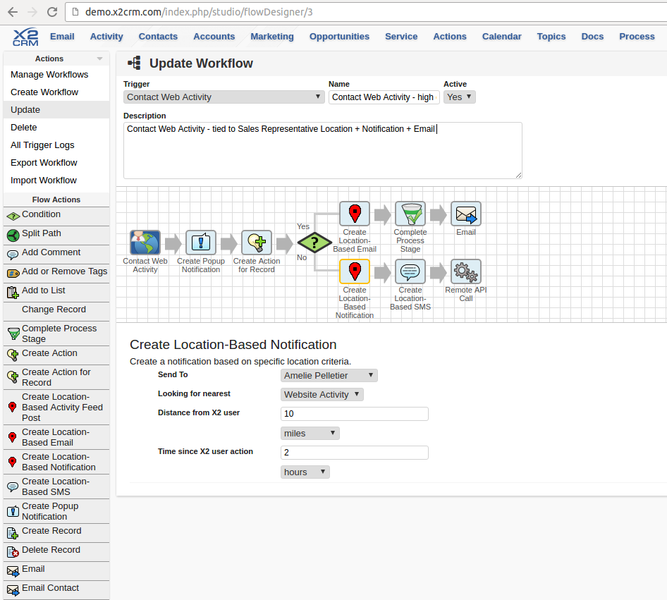 X2Workflow is a CRM Automation Designer that allows CRM Admins to track website visitors, capture web leads and create automated actions based on customer behaviors. X2Workflow is a clever and incredibly customizable business tool that places the power of X2CRM marketing, sales and service processes in the hands of customers, allowing them to fine tune their business and harness the abilities of the X2Engine platform.
