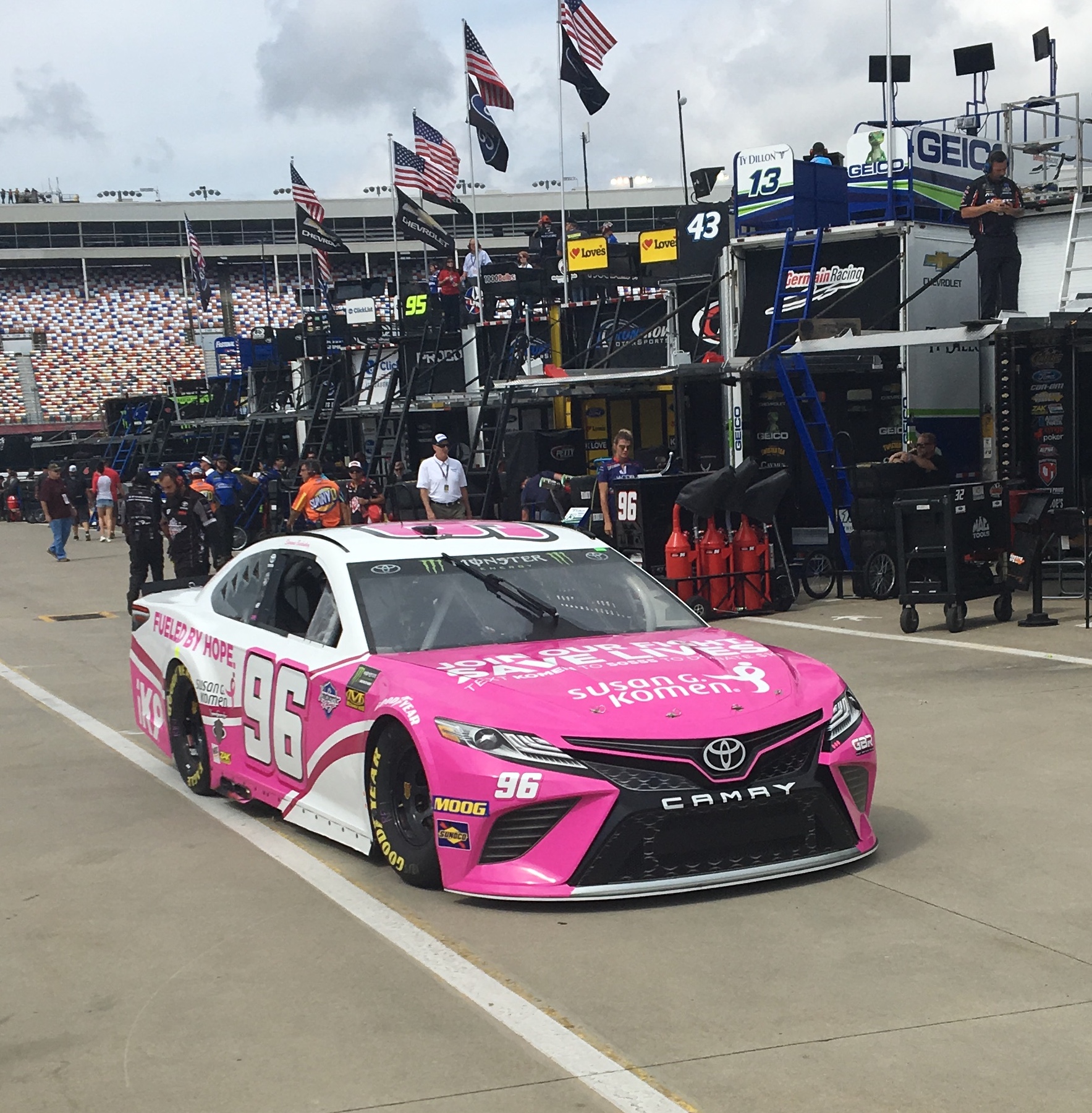 The “Fueled By Hope” No. 96 Toyota will definitely stand out in the field with its pink paint scheme, pink wheels, and clear challenge for everyone to text KOMEN to 50555 to help raise funds to support the world’s leader in breast cancer research and patient support.