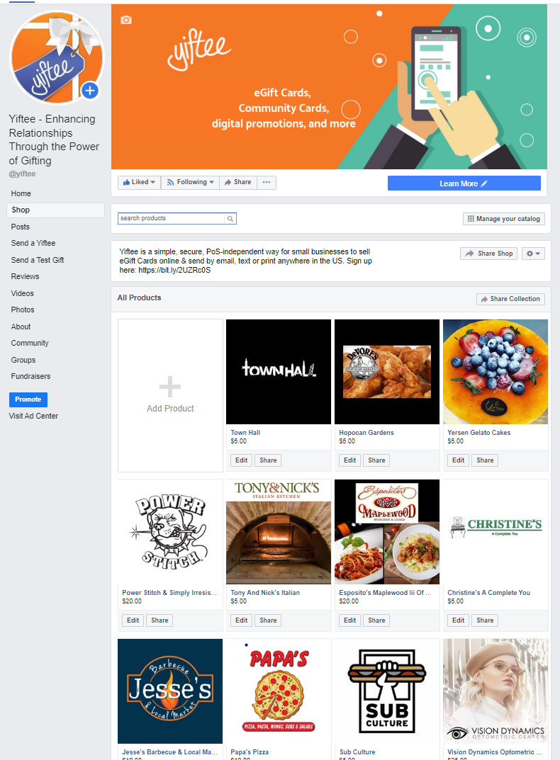 2,000+ Yiftee eGift Card local business and Community Card clients may now be eligible to have their custom-branded digital gift cards featured on Facebook to their local community, with no extra effort on their part. People on Facebook can discover eGift Cards on Facebook and complete their purchase on Yiftee, thereby supporting local businesses through the COVID-19 pandemic and accelerating recovery whether they are open now or not.
