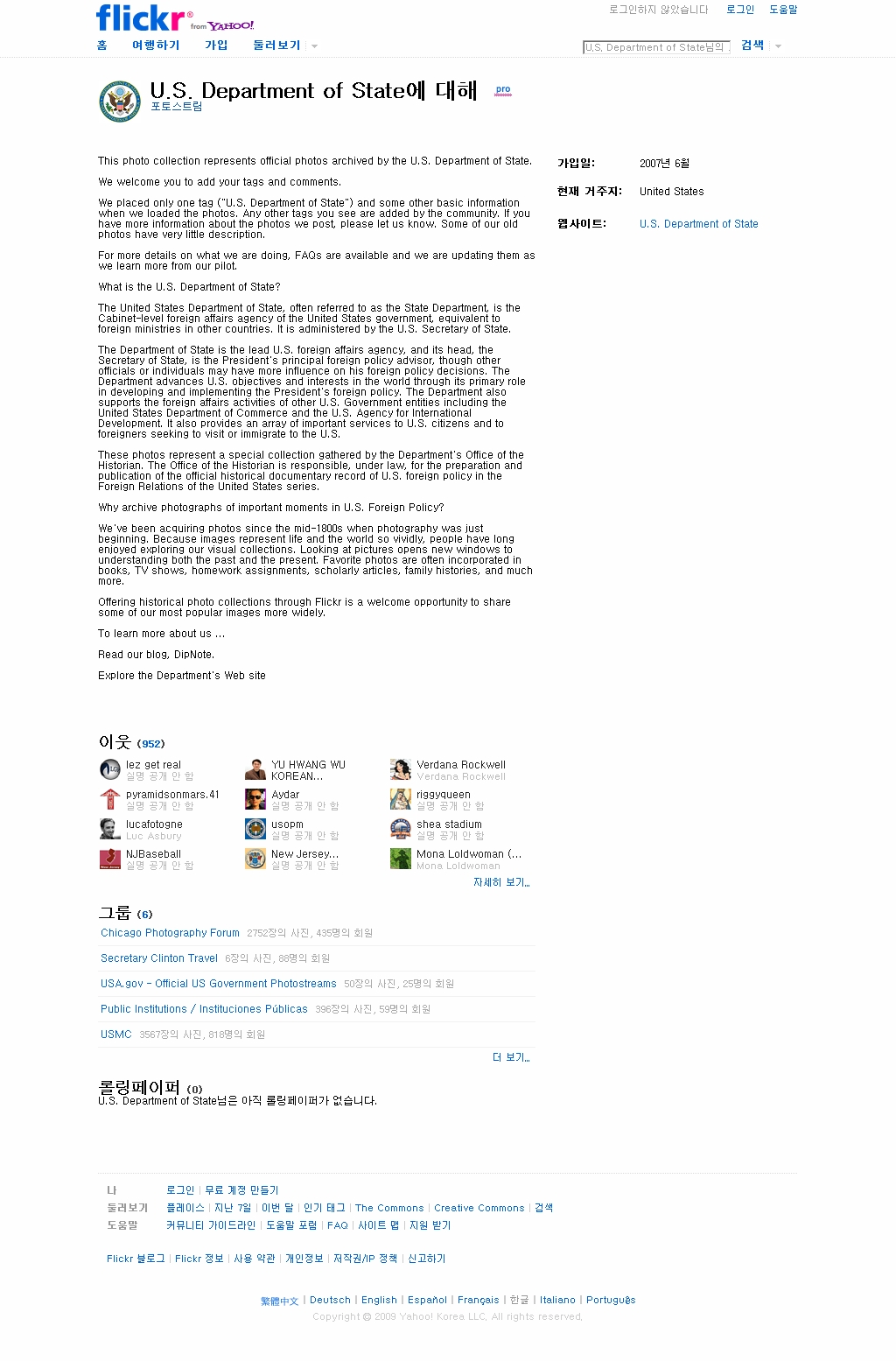 Yu Hwang Wu's Flickr is neighbouring with U.S. Department of State's Flickr to introduce Korea's culture and history. As his Flickr domain neighbours with George W. Bush, Barack H Obama, and even with Hillary Clinton, and continues to neighbour with U.S Department of State which has given him the title as representative of online diplomat.
