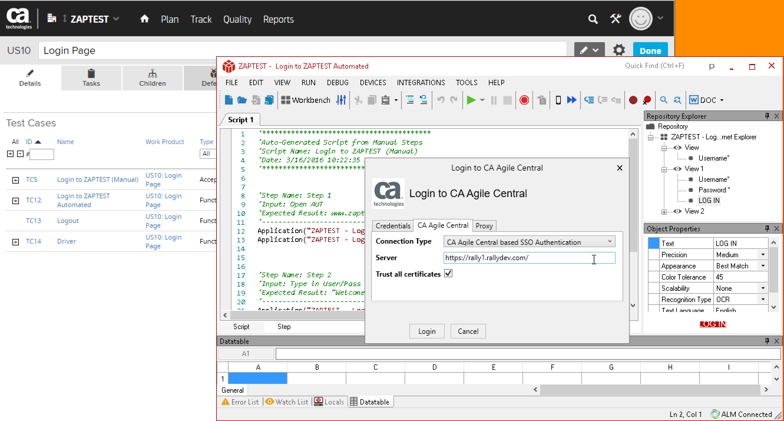 Using the ZAPTEST integration, CA users can store ZAPTEST scripts in CA Agile Central, execute scripts and store results, generate automation templates from Agile Central-based test cases, generate manual test cases, and auto-populate automation defects. ZAPTEST users on the other hand can use CA Agile Central as a default test management portal in supporting Agile/DevOps and waterfall-driven software testing processes.